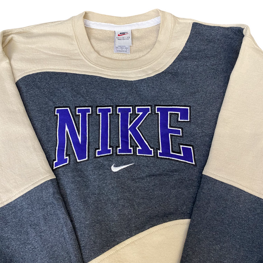 Nike Reworked Sweatshirt Mens Large Cream Grey Embroidered Spellout Logo Vtg Y2K
