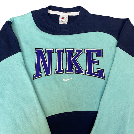 Nike Reworked Sweatshirt Mens M Navy Aqua Embroidered Spellout Logo Vintage Y2K