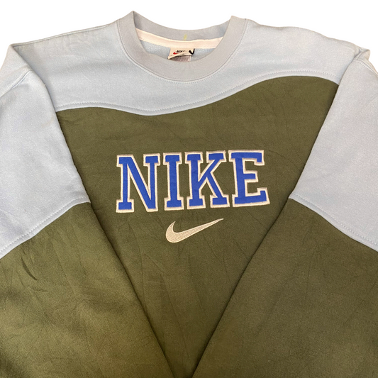 Nike Reworked Sweatshirt Mens L Olive Blue Embroidered Spellout Logo Vintage Y2K