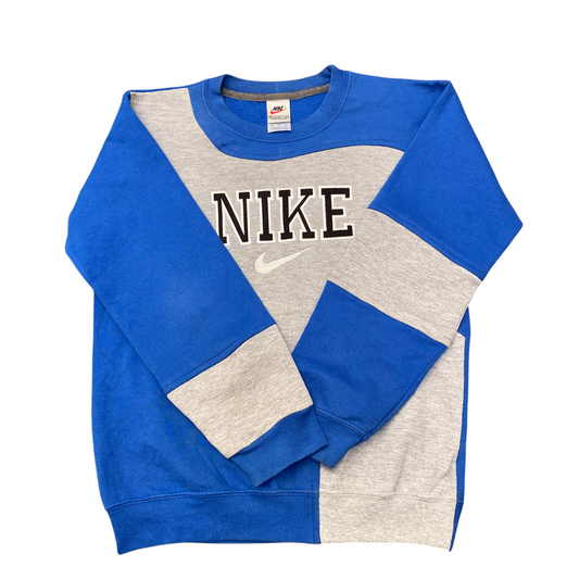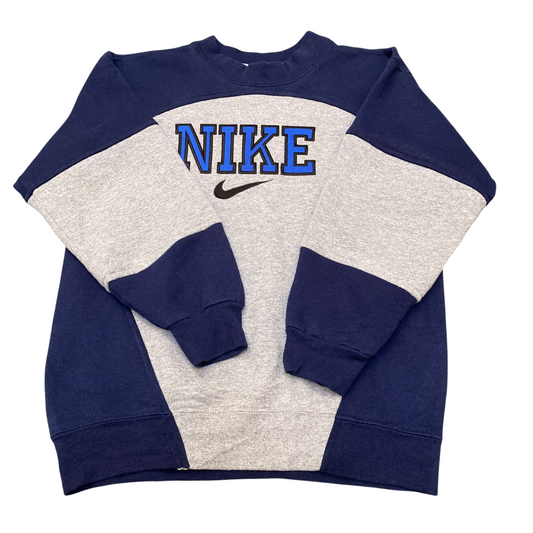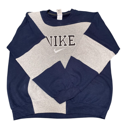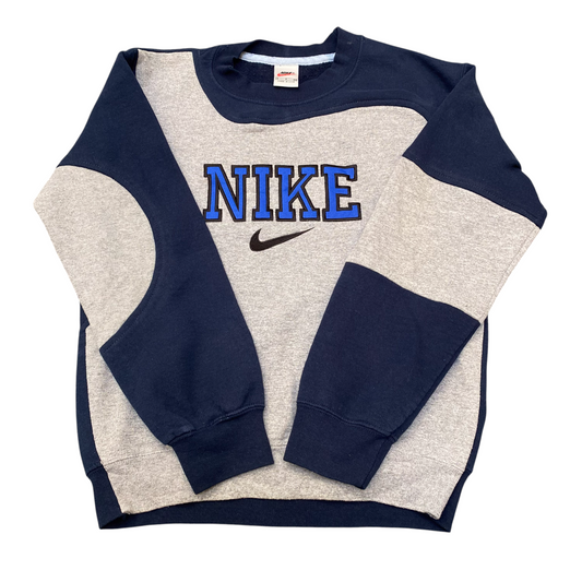 Nike Reworked Sweatshirt Mens Small Navy Grey Embroidered Spellout Logo Vtg Y2K