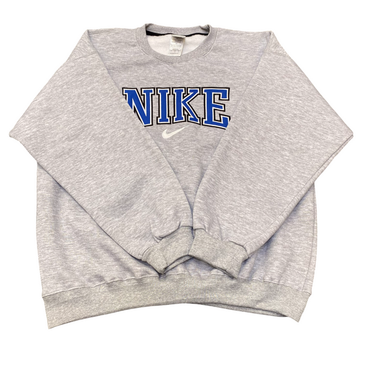 Nike Reworked Sweatshirt Mens S Blue Grey Embroidered Spellout Logo Vintage Y2K