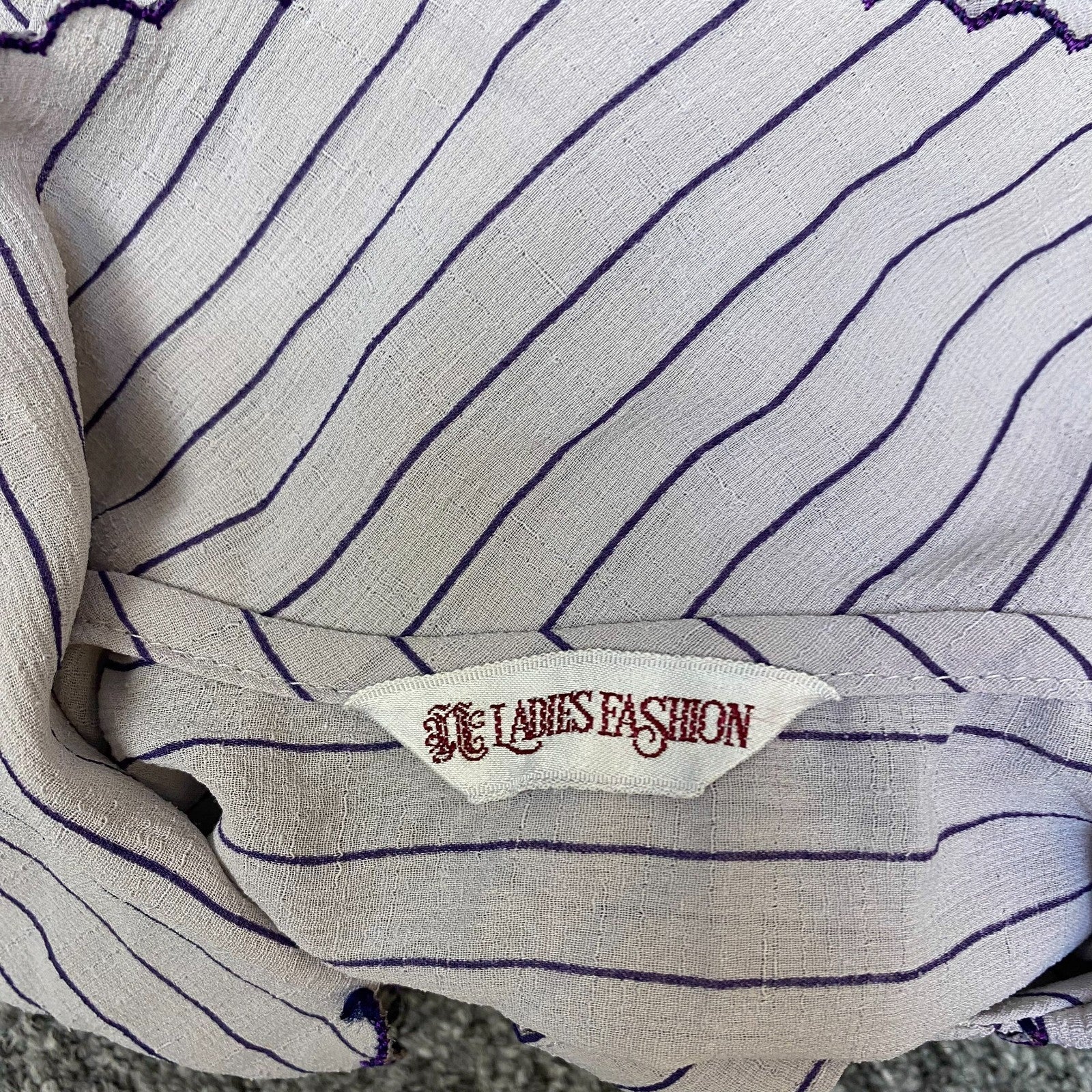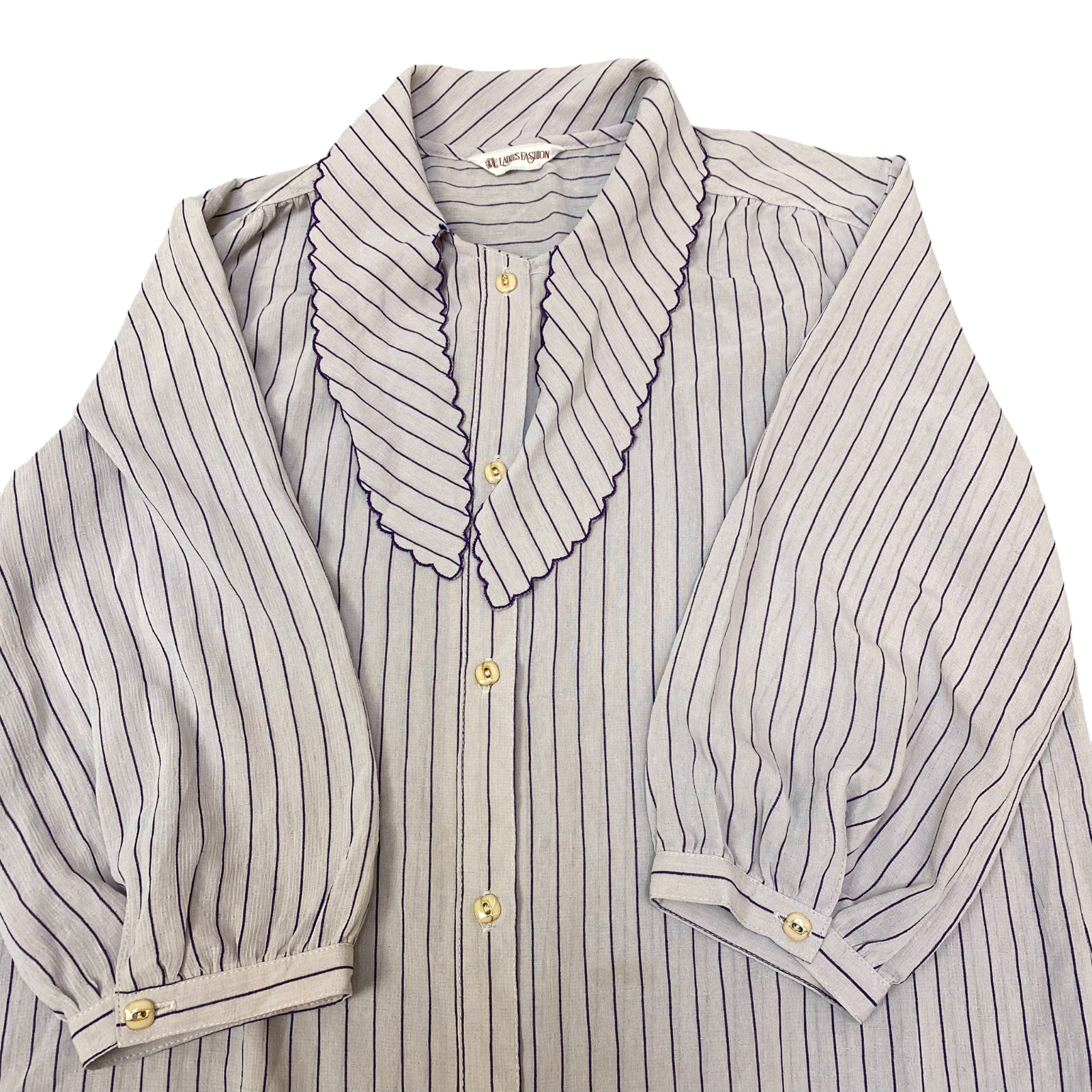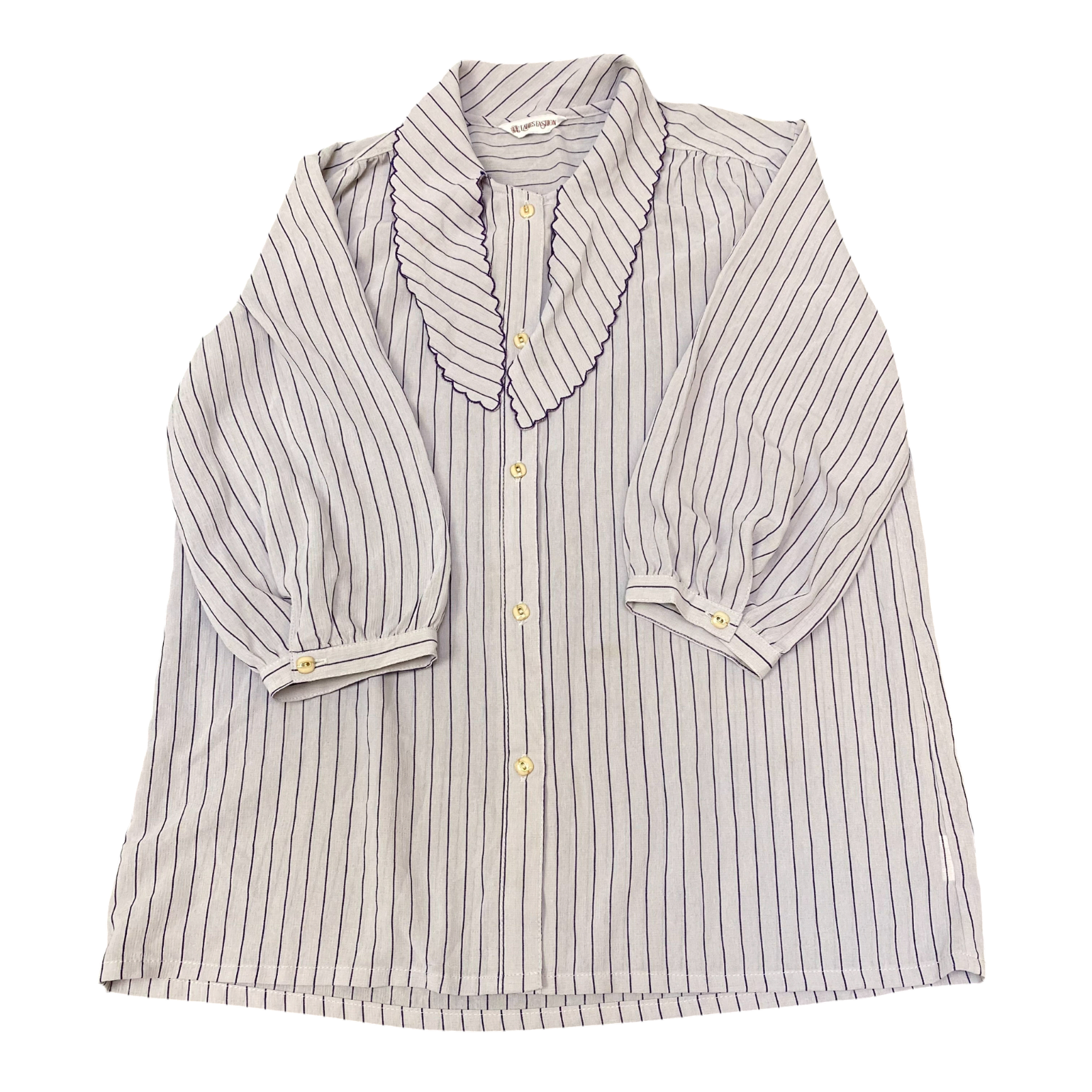 Blouse Top Womens M White Blue Striped Scallop Collared Long Sleeve Button Front