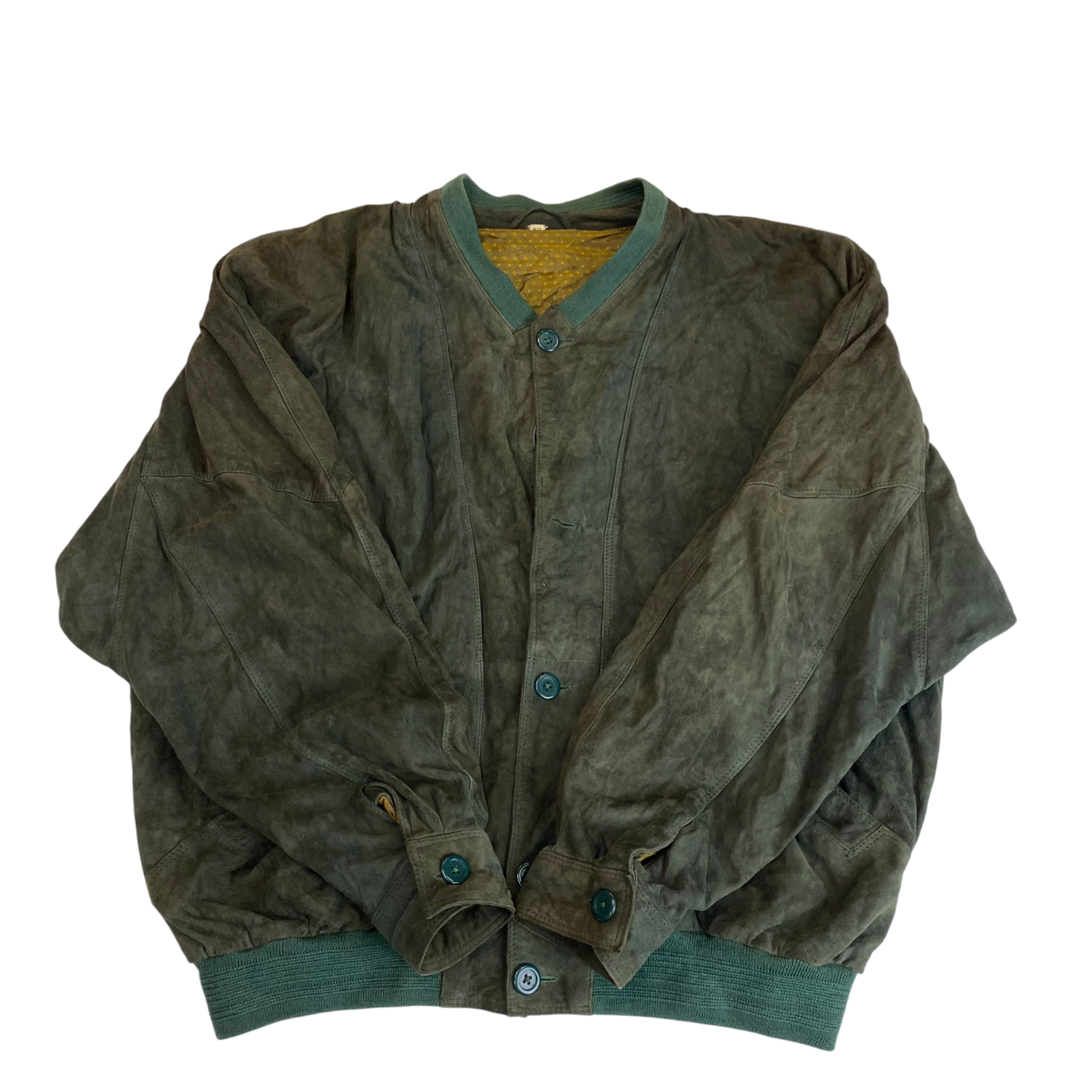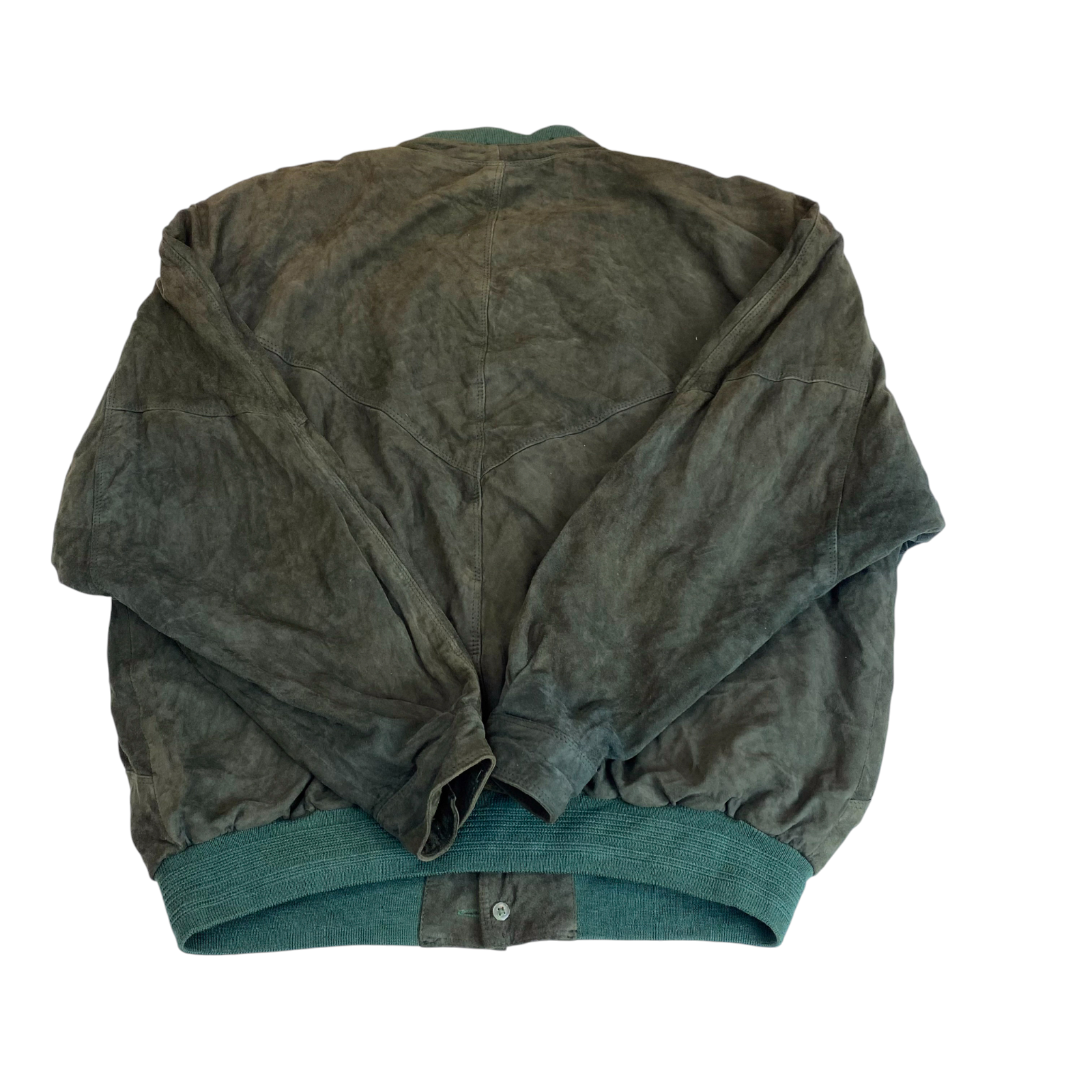 Bomber Jacket Mens L Green Suede Leather Pockets Long Sleeve Button Front