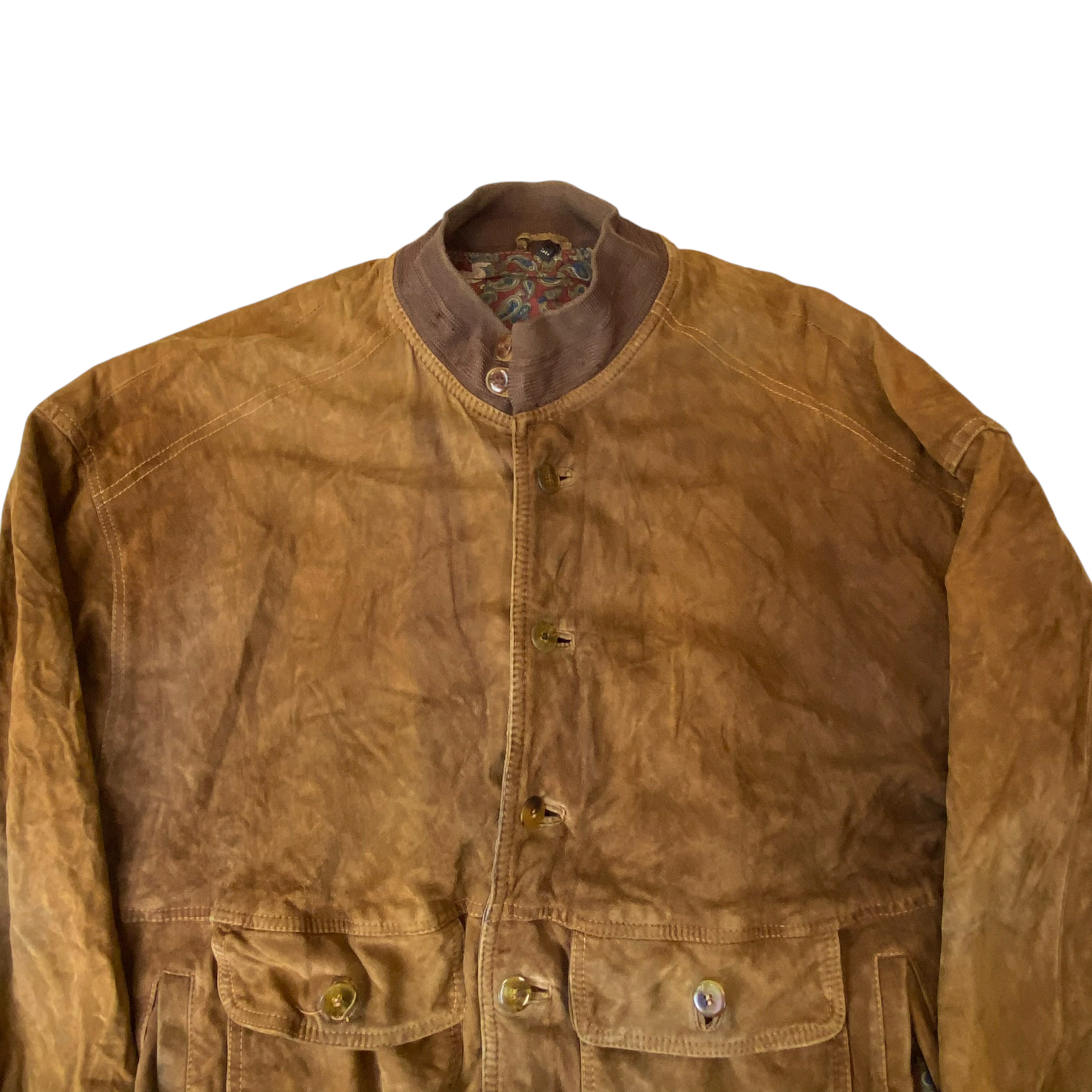 Bomber Jacket Mens Large Brown Suede Leather Pockets Long Sleeve Button Front