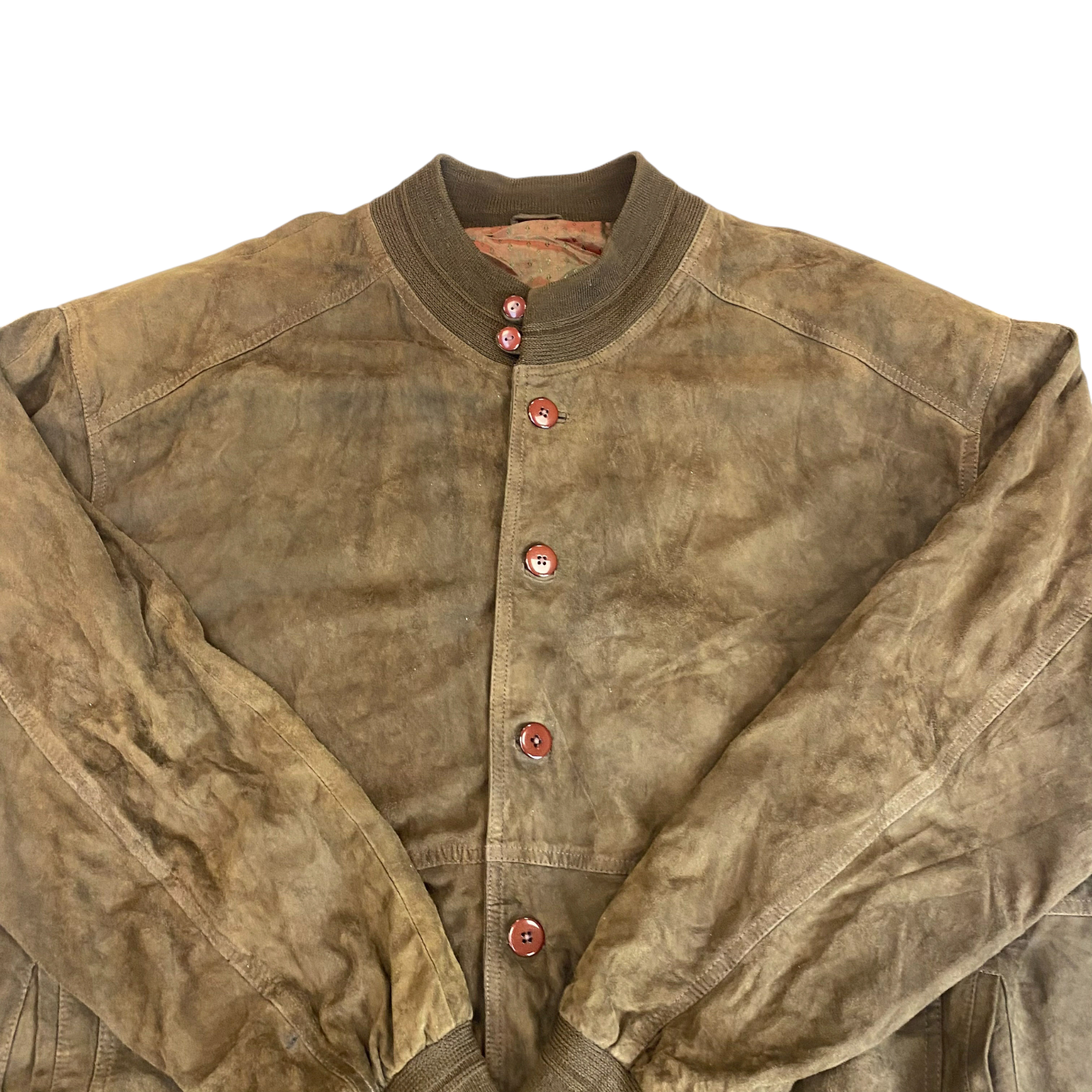 Bomber Jacket Mens XL Green Suede Leather Pockets Long Sleeve Button Front